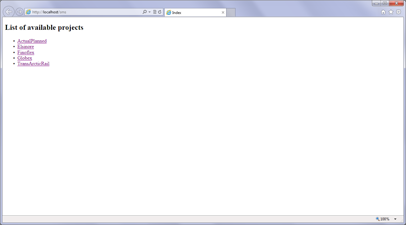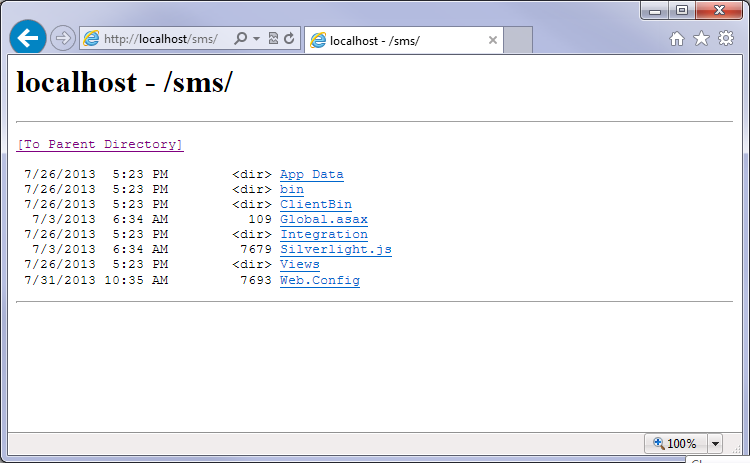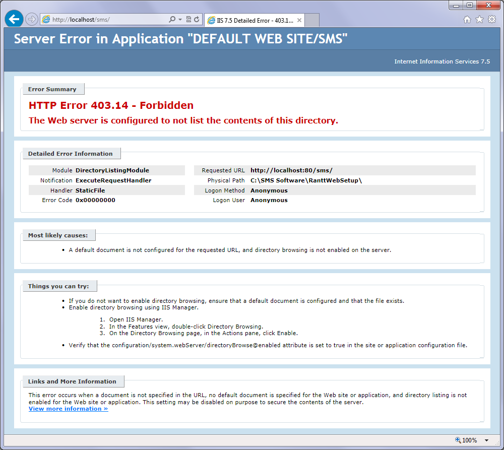 If, after installation of the Rantt Web Host application you don’t see the Rantt project browser, after navigating to http://localhost/SMS/ but instead of the Rantt project directory page you should have, as below: