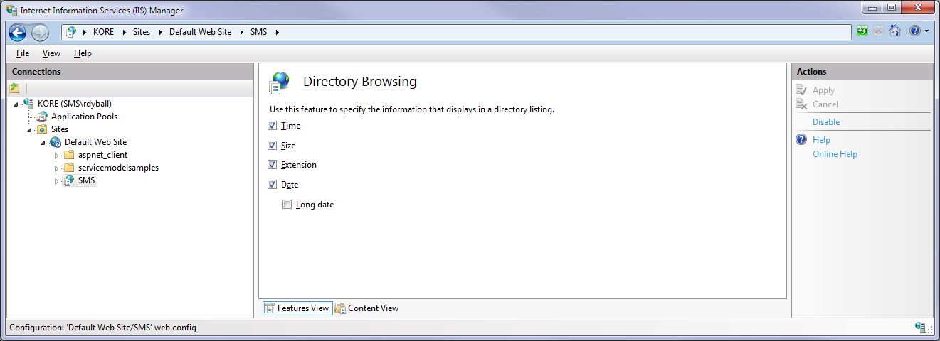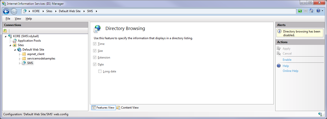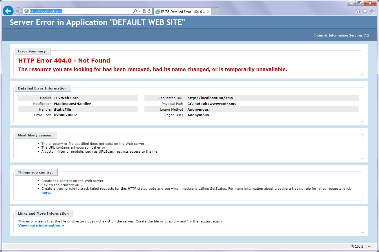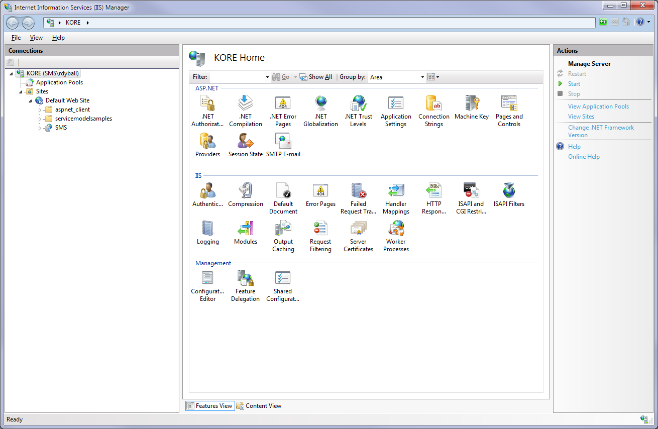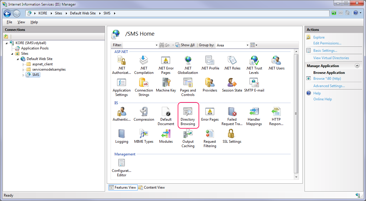 To correct this issue, click Start, type inetmgrthen press enter. Note: If you do not have inetmgr installed, follow this procedure to add the IIS Management Console Once in Internet Information Server Manager open up the left hand section, through Sites, then Default Website, to reach the SMS website. Highlight SMS on the LHS, then click Advanced Settings on the RHS