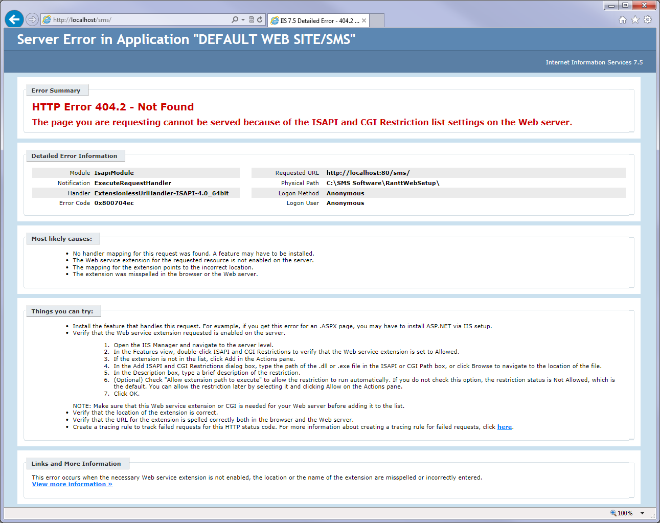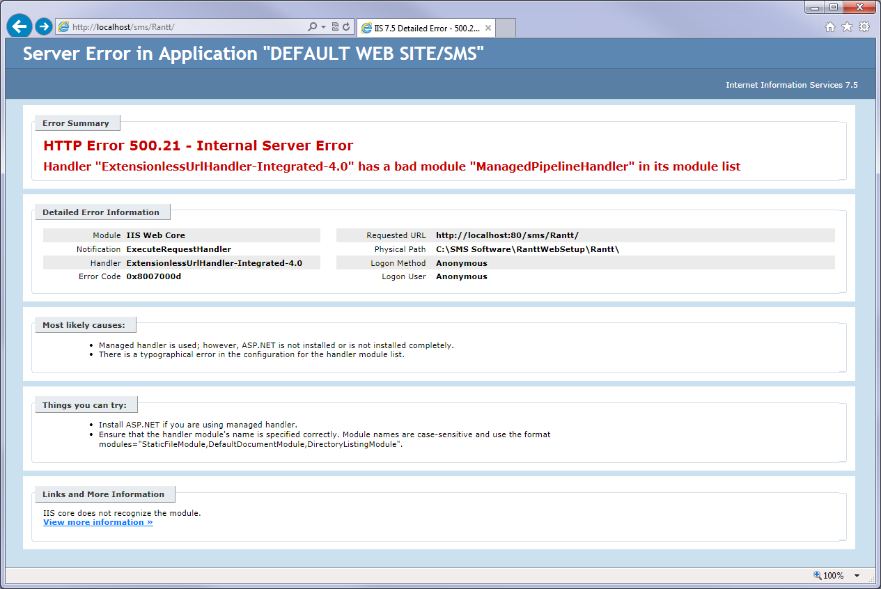 Next check that you have .Net 4.5 installed, that ASP.Net 4.0 was installed and that Rantt Web Host is set to use the ASP.Net 4.0 Application Pools .