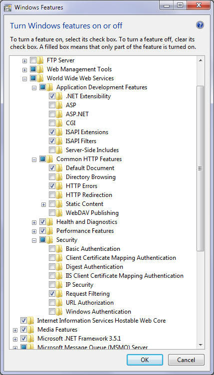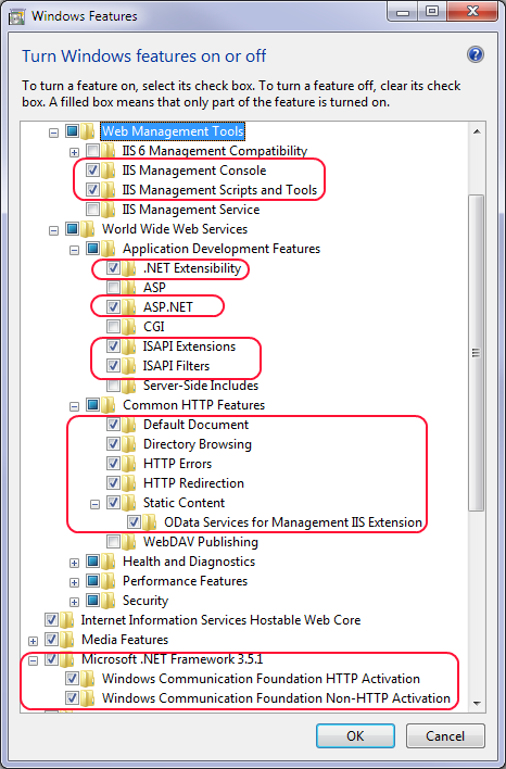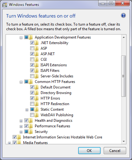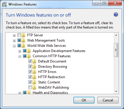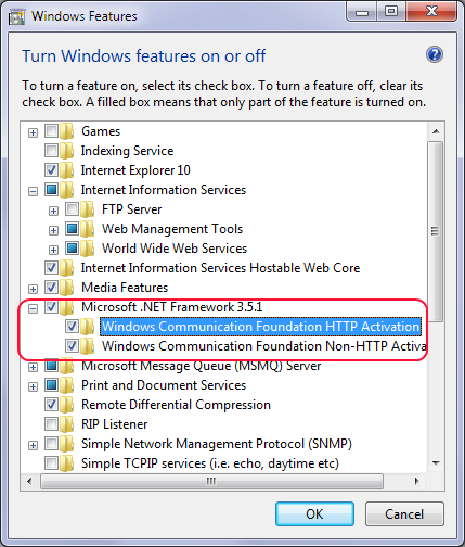 To correct this, go to Control Panel, Programs, “Turn Windows features on and off”, and turn on both HTTP and non-HTTP web service features as shown below: