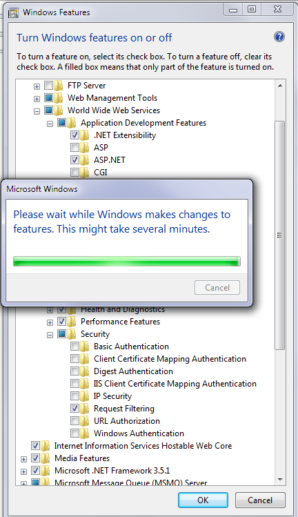 There will be a short installation (usually less than a minute), after which the Windows Feature dialogue disappears.