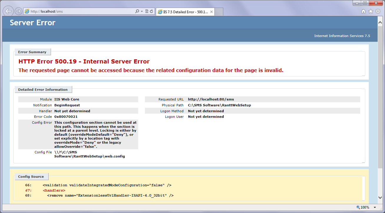 HTTP Error 500.19 - Internal Server Error The requested page cannot be accessed because the related confirmation data for the page is invalid.