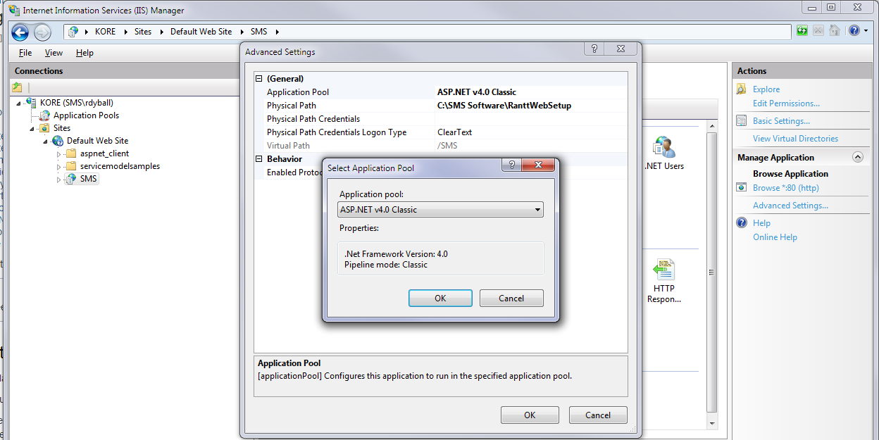 Once the Advanced Settings window appears, click on the “Application Pool” to bring up the “Select Application Pool” window, then verify that the pool was set incorrectly to “ASP.Net v4.0 Classic”, the incorrect settings are below:
