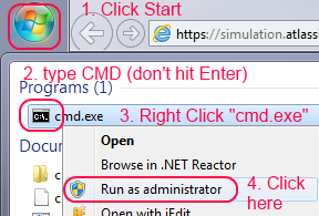 Click start, type CMD (don’t hit enter), and then when the words “cmd.exe” appears, right click cmd.exe as shown above, then click “Run as Administrator”