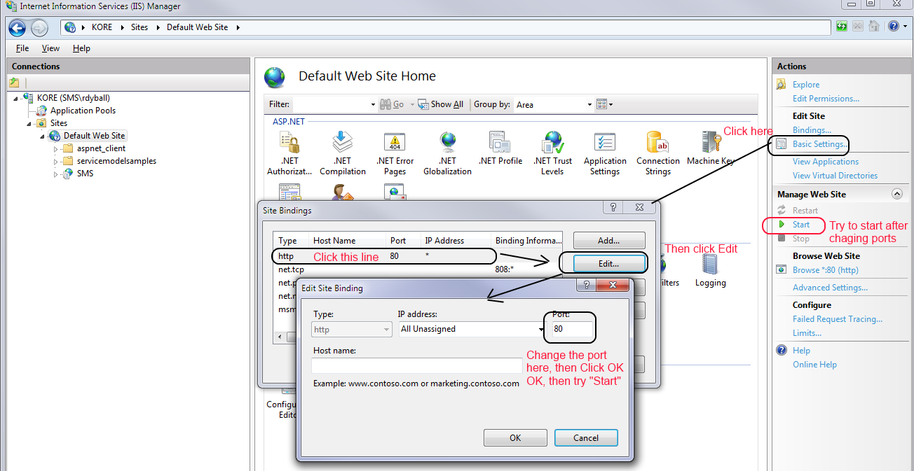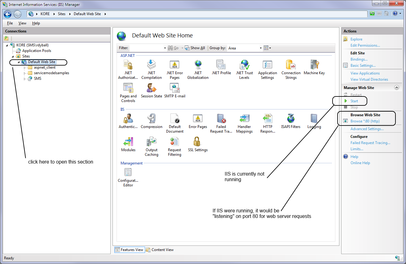 note in the top right corner, “Start” is enabled. This means that IIS is not running. Open up the section on the top LHS, when you see “Default” Web Site”, click on it. On the right hand side you will see what port your web server would be on, if it was running