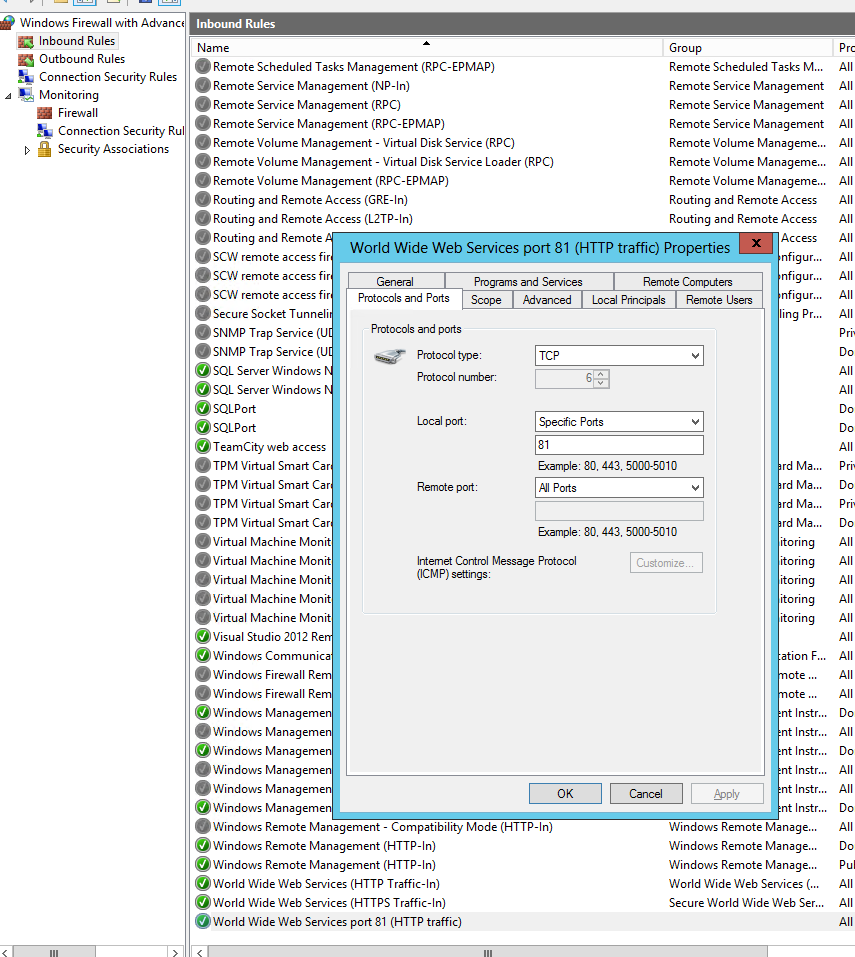 Firewall settings can be quite complex, and vary considerably between Windows desktop versions and Windows Server versions. If using port 80, the default web server port, it is most likely the case that the rule was disabled and simply needs to be enabled. If on the other hand, the webserver was set to a different port, then it may be necessary to either add the port 81 to the current port 80 rules, or on some version of windows desktop/windows server, create a completely new rule to cater for port 81 web server requests. This is an example below from Server 2012 where a rule was created to allow web server requests to port 81: