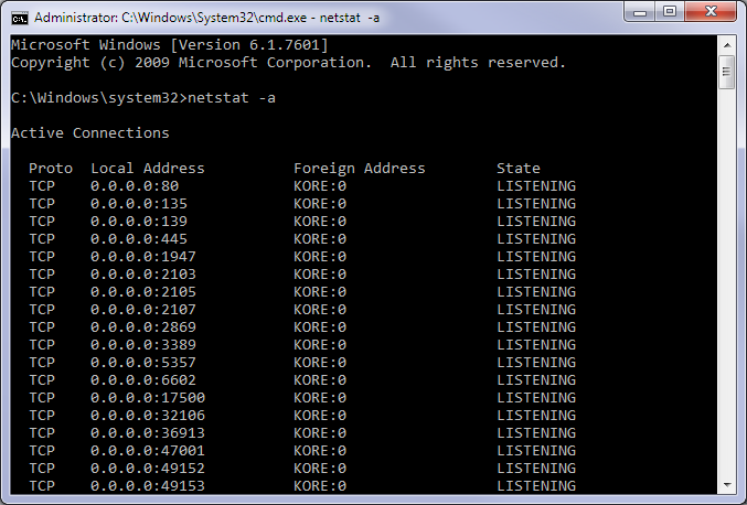 looking through the list (the machine name here is “KORE”), you will note there is a “listener” on port 80 already.