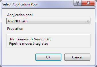 Change the Application Pool to “ASP.Net v4.0”, the ”Select Application Pool” window should now appear as below: