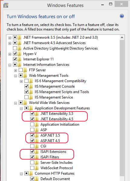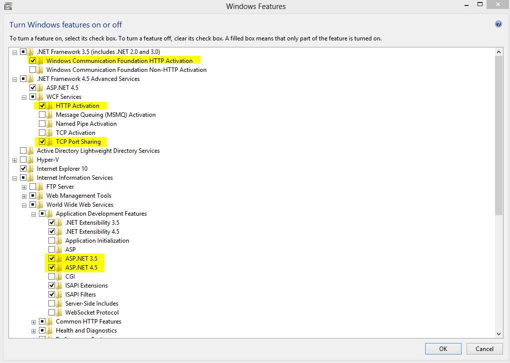 If using Windows 8 or Server 2012 and if present, enable both .Net 3.1 and .Net 4.5 features as shown in the Windows 8.1 Preview screenshot below: