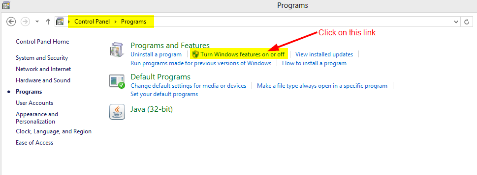 Click on Control Panel, Programs, Turn Windows Features On and Off, as below: