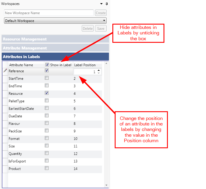 - Change the position of each attribute in the labels by double clicking on the position cell and changing the value.