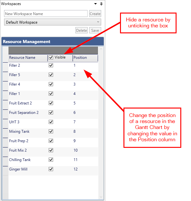 - Change the position of a resource in the Gantt chart by double clicking on the position cell and changing the value.