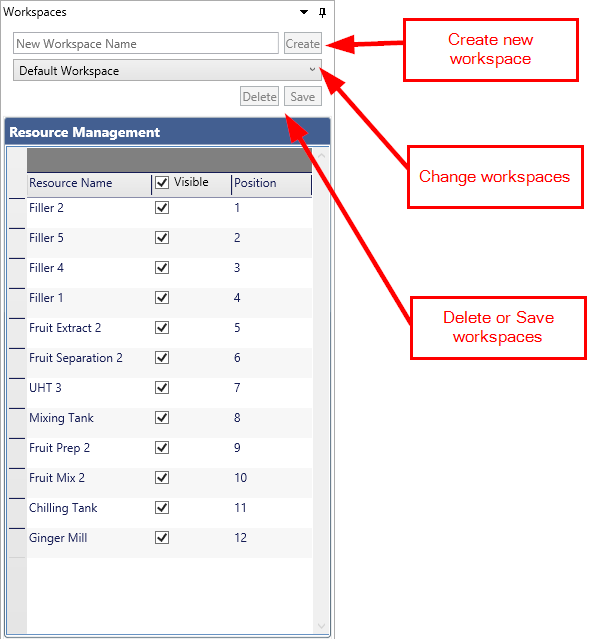 Once a workspace is saved you can easily switch between different workspaces you have created. When you select a workspace from the drop down box, all the settings for the workspace will be restored.